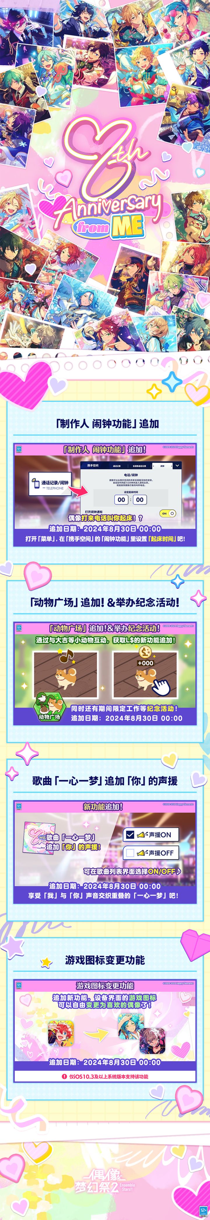 【活动预告】⭐「制作人 闹钟功能」追加⭐8月30日00:00起,游戏内追加制作人闹钟功能打开【菜单】在【携手空间】的【闹钟】功能里设置起床时间吧!⭐「动物广场」开放⭐8月30日00:00起,游戏内将开放「动物广场」动物们会从各种地方捡到L$,点击动物收取L$!随着事务所级别的提升,来广场玩耍的动物会增加♪给动物喂食提升亲密度,动物每10分钟捡到的L$和存储L$的上限会提升!8月3