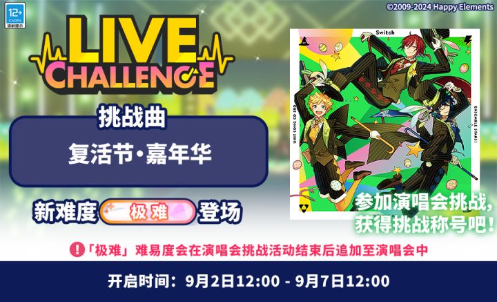 演唱会挑战即将开启!本次开启特殊难度【极难】的挑战曲是:「复活节・嘉年华」-Switch制作人快来挑战吧! 活动时间:9月2日12:00 ~ 9月7日12:00消耗1张【挑战通行证】即可参加挑战,活动期间每日00:00会赠送5张【挑战通行证】,制作人也可以使用钻石购买通行证进行挑战。演唱会挑战中会开启「练习模式」,「练习模式」不消耗【挑战通行证】,但「练习模式」取得的成绩无法被计入挑战