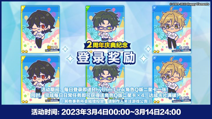 「2周年庆祝纪念」Q版卡片登录奖励活动时间:3月4日00:00 ~ 3月14日24:00活动期间,每日登录即送2周年纪念Rhyth Lin角色Q版二星卡一张!同时,完成每日日常任务即可获得该角色Q版二星卡×4,可达成卡片满破!(其他事务所后续会陆续进行投放,请制作人关注游戏公告)快来登录游戏领取吧♪
