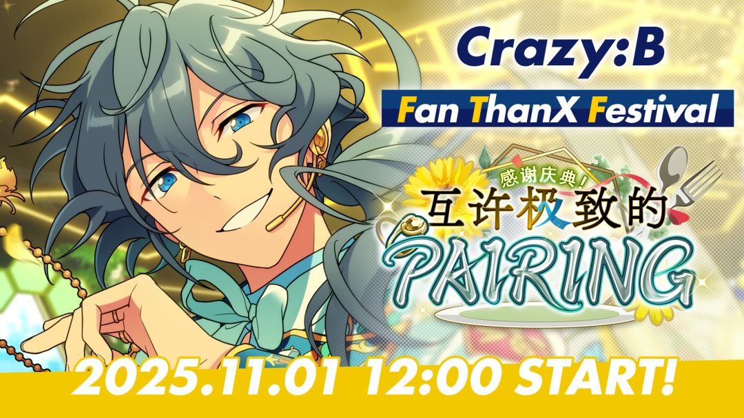 「感谢庆典!互许极致的PAIRING」将于11月1日开启 「Crazy:B」即将举办粉丝感谢庆典,丹希收到了负责构思内容的命令。然而,有关美食的方案却被悉数驳回。遭遇丹希迁怒的HiMERU决定为企划提供协助…… 请欣赏本期活动歌曲MV—— 「蜜诱・结合」-Crazy:B