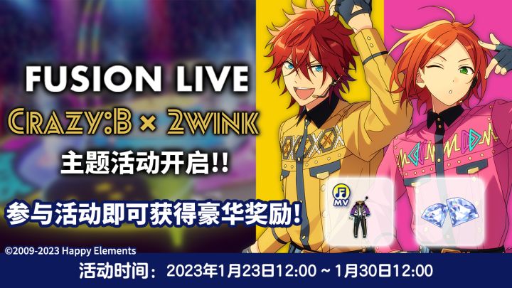 『FUSION LIVE』——Crazy:B × 2wink1月23日12:00,将开启『FUSION LIVE』活动第七期:Crazy:B × 2wink!活动时间:1月23日12:00 ~ 1月30日12:00活动内容:FUSION LIVE活动奖励共分为3周目,在活动期间完成关卡任务可获得MV服装【FUSION UNIT(Crazy:B × 2wink)服装】、【钻石】等多种奖励。