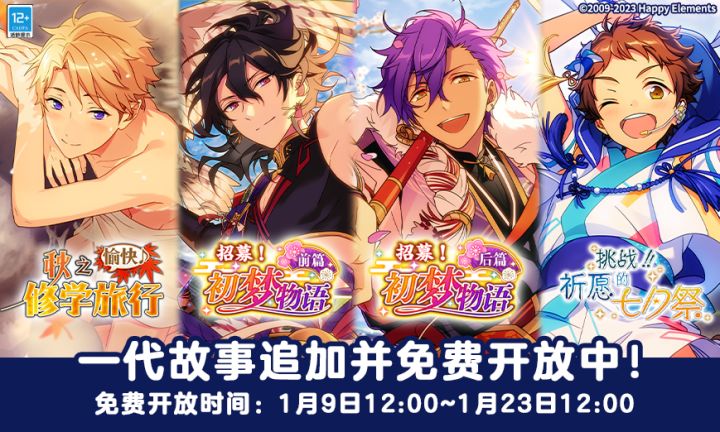 【「ES」一代剧情追加预告】1月9日12:00 ~ 1月23日12:00 期间,游戏内将免费公开「ES」一代活动剧情故事:「挑战!祈愿的七夕祭」、「愉快♪ 秋之修学旅行」、「招募!初梦物语(前篇)」、「招募!初梦物语(后篇)」!活动结束后未阅读的故事需要消耗钻石或ES回忆钥匙进行解锁阅读。同时部分一代故事按照运营排期会随着对应组合或关联再次开启免费开放,具体内容请关注后续官方公告。欢迎各位