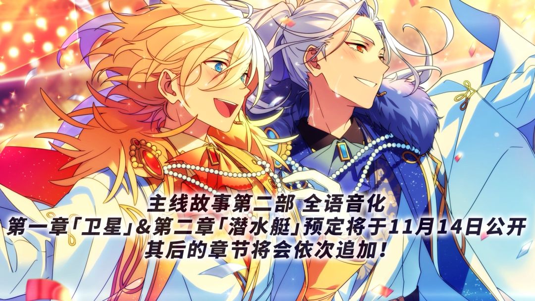 #ES2二周年庆# 周年预告|「SS」篇全语音化 主线故事第二部「SS」篇全语音化上线! 11月14日版本更新后,游戏内将追加主线故事第二部「SS」篇的第一章「卫星」&第二章「潜水艇」全语音。 -其后章节的语音也将会依次追加,请关注后续公告安排。 周年活动持续报道中,还请继续关注后续公告 #偶像梦幻祭2#