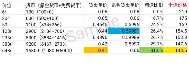 十连3500钻,而各个氪金档位单价不同就导致十连价位不定,通过计算在143.5-210范围内不等,由此可见各个档位氪金获利是存在一定差距的,所以在此总结出来供大家参考。有图可得单纯氪金648获利最高,而大多数玩家并不会单单都氪648,因为游戏区分了付费货币与免费货币,付费货币可用于每日一次单抽以及付费池子,所以就低氪玩家而言我推荐128这个档位,128的付费货币单价最低且货币单价居中,与下一档2