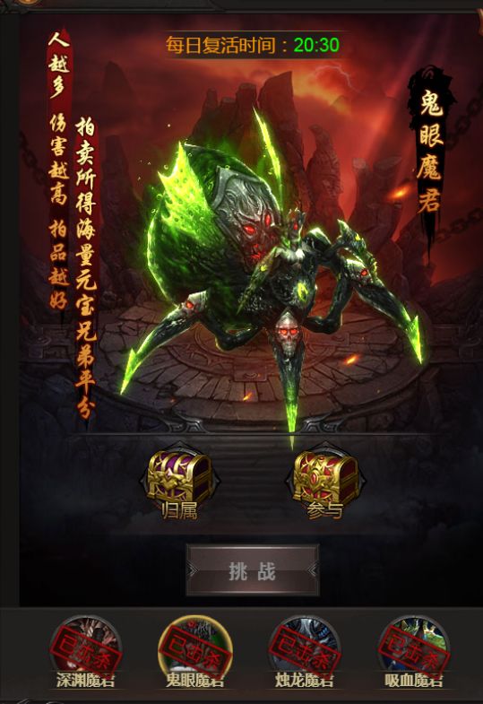 在《王者圣域》中,魔界的4位魔君会在每日的20:30准时入侵玛法大陆!玩家可在活动开始后,选择击杀其中一位魔君(选择后不可改变)。魔君死亡后,归属者行会在场景内的成员都可获得一份归属奖励,并有极大几率获得极品奖励进入到行会拍卖行。行会拍卖成功拍卖后的元宝将会平分给参与争夺的行会成员。当然,该地图是跨服帮派模式,您可能会遇到跨服的其他帮派玩家的攻击。