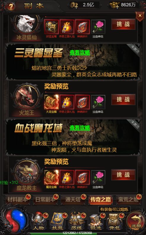 游戏当中比较强的副本要数之路了,它不仅奖励丰厚拿到手软,每个阶段的挑战也是回味无穷。要求:开区第6天及一转以上奖励:泣血神花,神装碎片,强化道具,宝箱等(内容视副本而定)奖励获取:通关当前副本,关卡总数10层简析:此副本是为数不多可以的副本,奖励丰厚,而且每周都会重置一遍,通关后继续领取。虽然看似简单,要求不高,但根据关卡的配置,非常考验玩家的配合。战力要求:该副本是以全员总战力计算,直