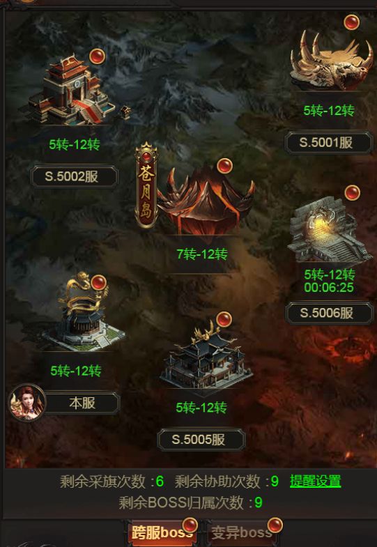 天数达到15天将开启跨服BOSS地图苍月岛,达到5转可参与。在各区服战场会刷新战旗抢夺到战旗可以获得丰厚的奖励,每天拥有2次战旗归属机会如当天为使用完可以累积到下一天,最多可累积6次。每人每天可获得3次协助次数最多可累积9次,当有协助次数的玩家在同行会的玩家获得归属时,可以获得一份协助奖励变异BOSS跟跨服BOSS共享归属次数,都可设置BOSS提醒。
