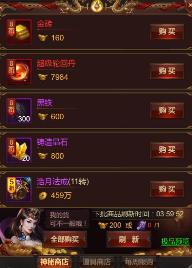 商城是《王者圣域》一个非常方便的系统,它能够提供各种装备、材料、道具等很多提升战力非常重要的直接购买方式。商城分为神秘商店,道具商店,每周限购。道具可以直接购买,而神秘商店不同的是刷出来的道具、装备等是有折扣的,所以看见便宜的好东西不要放过哦。而每周限购次数刷完之后,只能等下周重置次数才能购买。