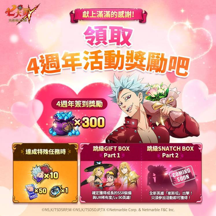 ✨ Grand Cross 4週年盛大慶典簽到活動 I ■ 活動期間:05/30 維護後 - 06/27 08:59 ■ 活動獎勵 ※ 活動期間首次登入的日子即為第1天。 ※ 每天15:00第1次登入時,即自動領取1次簽到獎勵。 ※ 已領取所有獎勵或活動期間結束時,則不會顯示簽到活動頁面。 ※ 只要參加本簽到活動1天以上時,活動結束後至2023年07月25日 08:59可領取獎勵。 ✨ G