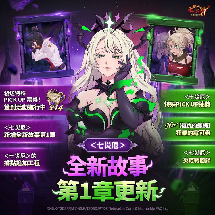 ※ 新英雄可在「<七災厄>特殊PICK UP抽獎活動」中獲得 ■ <七災厄> 第1章 "顯現的黑幕" OPEN - 章節10 "<第180話>就算你死了"完成時,將開啟<七災厄> 第1章。 ■ 新增加工卡 ■ 新增聖物 ■ 新增時裝 - 【復仇的鏈鋸】 - 組合販賣期間:04/04 維護後 - 04/18 14:59 - 單品販賣期間:04/18 15:00 - 常態販售 * 僅顯示追加能力