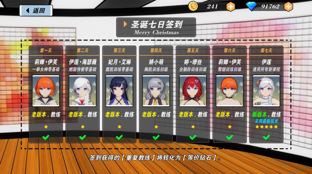 更新内容: 一、【降低了钻石获取难度】,从训练40分钟获取200钻石,改为了训练20分钟获取400钻石。 二、【降低了解锁内容需要的钻石】,解锁全角色全服装从需要1W钻石,改为只需要7K钻石。 三、【取消了角色抽卡】,现在你可以直接用钻石解锁喜欢的角色了。 四、新增了【急速减脂进阶】课程,并且【直接获得】,共计18动作全新动作。 五、新增了【活力校园.长】、【活力校园.短】两套服装。 六、开发了【