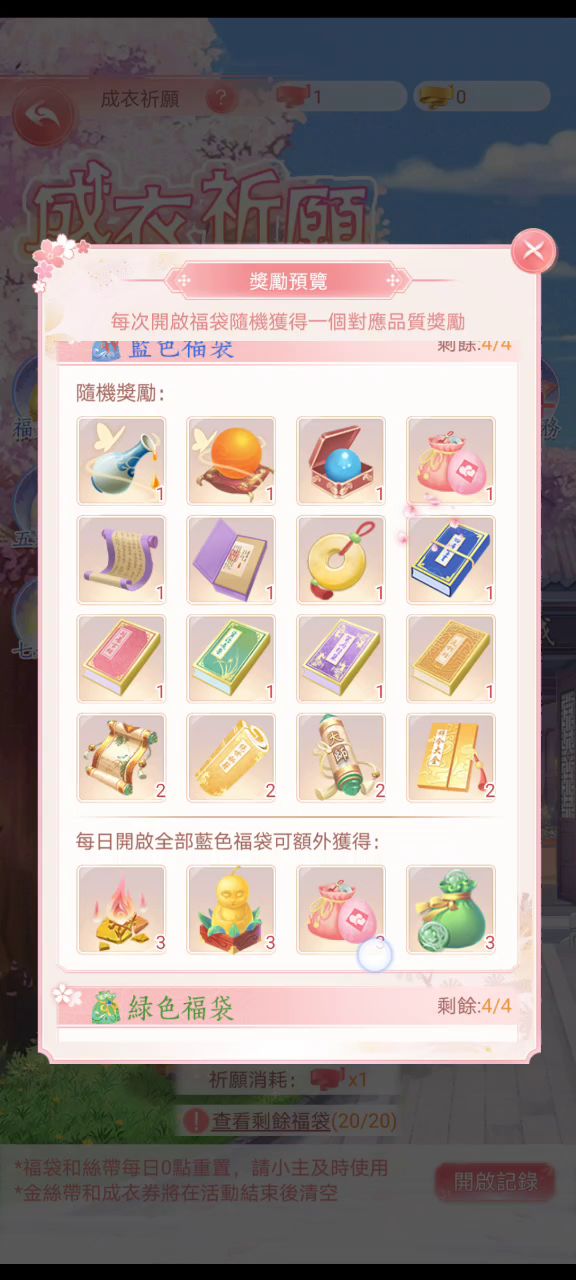 【花舞宫廷】台服成衣祈愿奖池/礼包/每日任务记录