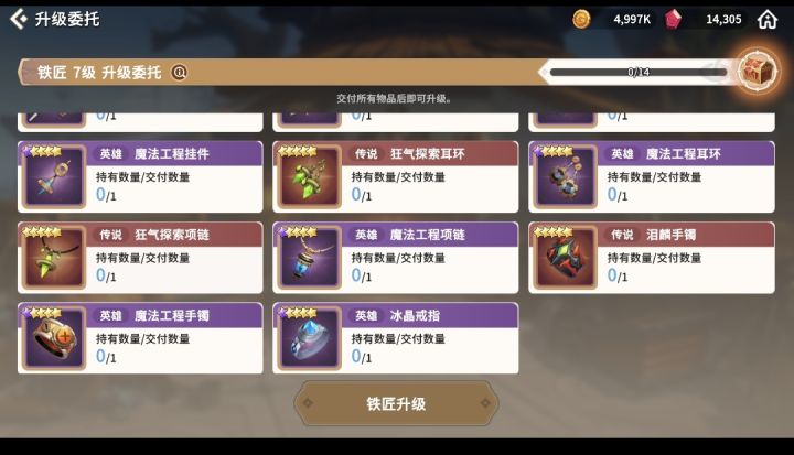 我发现在这游戏攻略好少呀,新玩家太容易走弯路了,比如铁匠升级需要材料里面就有不少被我之前分解了,现在把我自己升级需要的材料贴出来给大家参考,希望大家能少走弯路吧,贴图是4升5和5升6的,后续再来补6升7的。(马上开新多人本了,露服的来一起玩呀,名字就是论坛里这个名字,属性见下图)6升7已补。