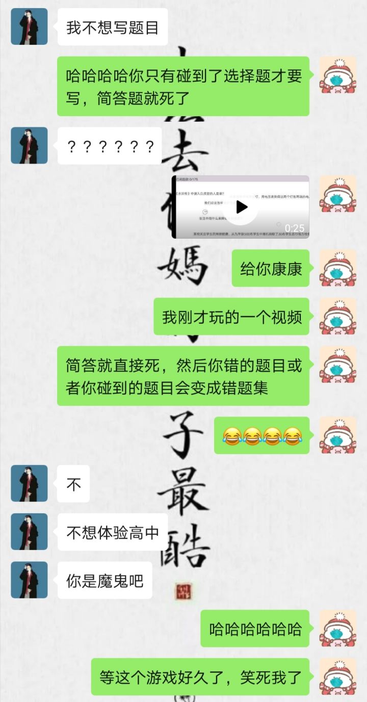 哈哈哈哈笑死我了,这个游戏说真的设计的很棒,而且也很好玩,没想到高中的题目还会,意料之外,答案写出来都是潜意识的。我就想推荐给朋友没想到被拒绝的,课件高中生活学习真的阴影面积巨大啊啊啊😂😂😂😂😂😂😂