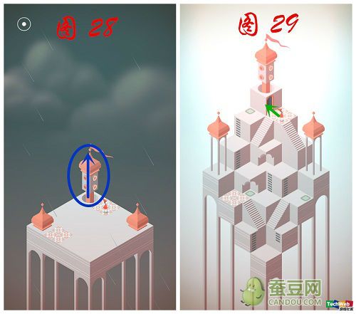 1.首先旋转整个房屋,让房屋呈现图2的方向。 2.转动图3蓝色圆圈内的旋转阀,让上方的楼梯下降,并移动艾达到踏板上,再将踏板上升后进如最上方的房间呢! 3.来到红色城堡中,按照 图4 箭头指示来到蓝色圆点标注的位置移动艾达,之后按照 图5 标注的方向转动 2次 城堡让城堡呈现 图6 的方向。 4.将艾达按照 图6 的指示移动到橙色圆点标注的位置。再按照 图7 的指示转动整个城堡 2次 使 图7 蓝
