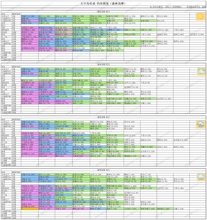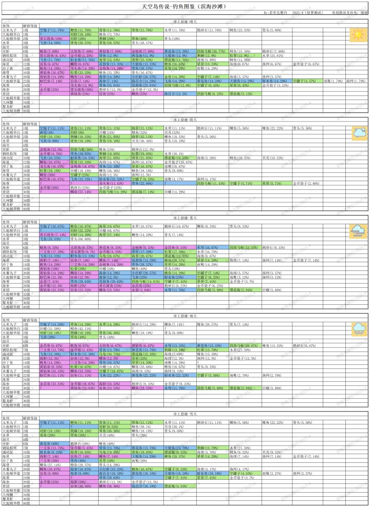 #天空岛传说 #天空岛传说岛屿创作大赛 花了很久终于把钓鱼图鉴摸出来了,简单唠叨两句首先,目前有三个鱼场,森林浅滩(以下简称一图),滨海沙滩(二图),冰上窟窿(三图),一图初始解锁,二图十级钓鱼等级解锁,三图二十级解锁,每个图都有晴阴雾雨四个天气,三图有额外的雪天(一二图没看见过,推测为三图专属,但是不确定)天气每六小时改变一次,每日0点、6点、12点、18点刷新,有概率不变,所以有时候不变
