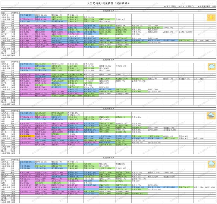 #天空岛传说 #天空岛传说岛屿创作大赛 花了很久终于把钓鱼图鉴摸出来了,简单唠叨两句首先,目前有三个鱼场,森林浅滩(以下简称一图),滨海沙滩(二图),冰上窟窿(三图),一图初始解锁,二图十级钓鱼等级解锁,三图二十级解锁,每个图都有晴阴雾雨四个天气,三图有额外的雪天(一二图没看见过,推测为三图专属,但是不确定)天气每六小时改变一次,每日0点、6点、12点、18点刷新,有概率不变,所以有时候不变
