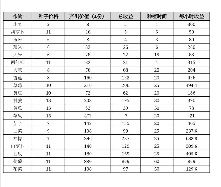 作物种植收益列表