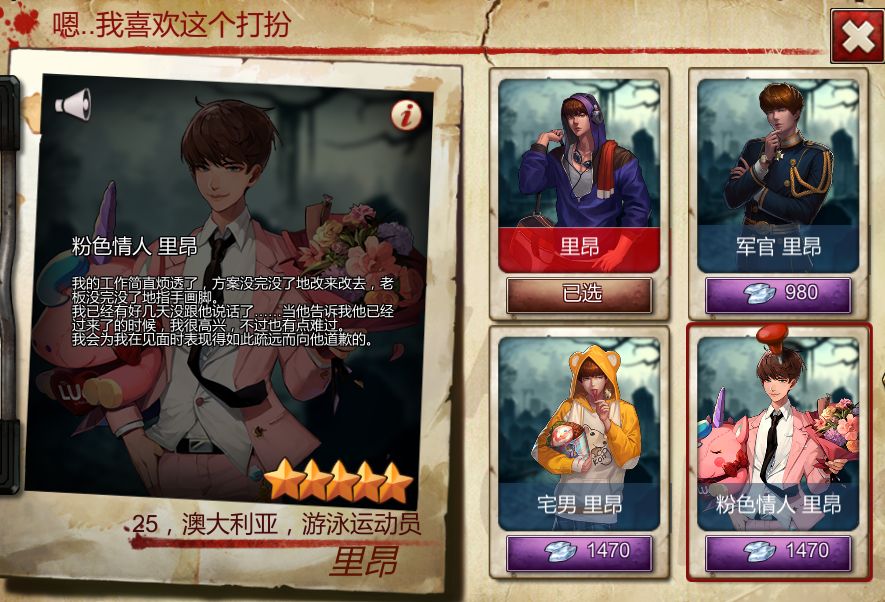 首先先说下里昂,(军官) 里昂的父亲是一个军人而里昂也是一位游泳运动员,所以战争开始里昂也理所而然的参加了战争成为了一个军官(澳大利亚是一个孤立的大岛所以没有什么太起眼的战争)这里就不多说明什么战争了,(宅男)战争结束后里昂因为参加过各种战争自然是有不少的积蓄然后背景故事也说过里昂可爱的东西痴迷所以靠着自己在战争拿到的钱在家当了一个宅男,(粉色情人)但是钱总有一天会用光,他也不可能去找他的父亲要钱