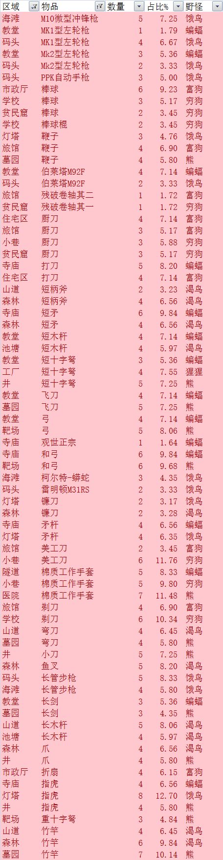 本文为的更新版,再重复贴一下上次的说明--------------------------------------------上次说明----------------------------------------------此表根据游戏内索引-区域中的数据制成,可能会有错漏,欢迎纠错使用说明:表中占比的意思是该物品数量占此区域所有物品数量的百分比由于区域内物品会因为被捡走而减少,被丢