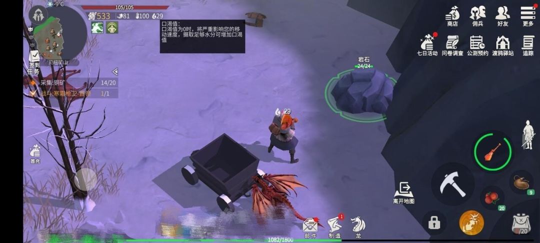 《冰原护卫者》是一款中世纪沙盒生存手游,游戏里有许多独特的系统,刚开始上手的朋友可能会有些迷茫,现在我就将为大家一一介绍。 一、口渴值 口渴值会影响人物的移动速度,口渴值低于20点时,我们将陷入口渴状态,移动速度将降低5%,当口渴值为0时,我们的移动速度将大幅降低。当我们的口渴值提升到80以上时,人物可以获得“精神”状态,额外增加5%的攻击速度。 如何恢复口渴值 食用食物或喝水可以让口渴值提升。当