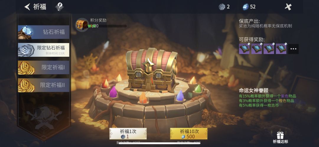 1月13日到2月2期间完成每日任务可升级领取奖励,和每月赛季有点类似,目测白嫖的奖励不太丰富的样子。。。 一级300,有25级 肝完全部每日任务可获得620积分,13天可完成。 不完成祈福活动可活动540积分,15天可完成。 卡片开启后,完成卡片里的任务才开始计算,建议每天上线就先到活动本开卡片。