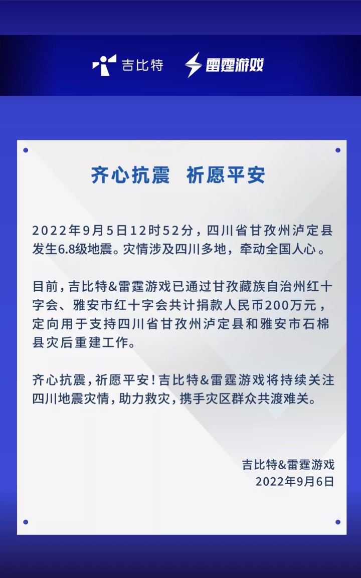 目前,吉比特&雷霆游戏已通过甘孜藏族自治州红十字会、雅安市红+字会共计捐款人民币200万元,定向用于支持四川省甘孜州泸定县和雅安市石棉县灾后重建工作。齐心抗震,祈愿平安!吉比特&雷霆游戏将持续关注四川地震灾情,助力救灾,携手灾区群众共渡难关。