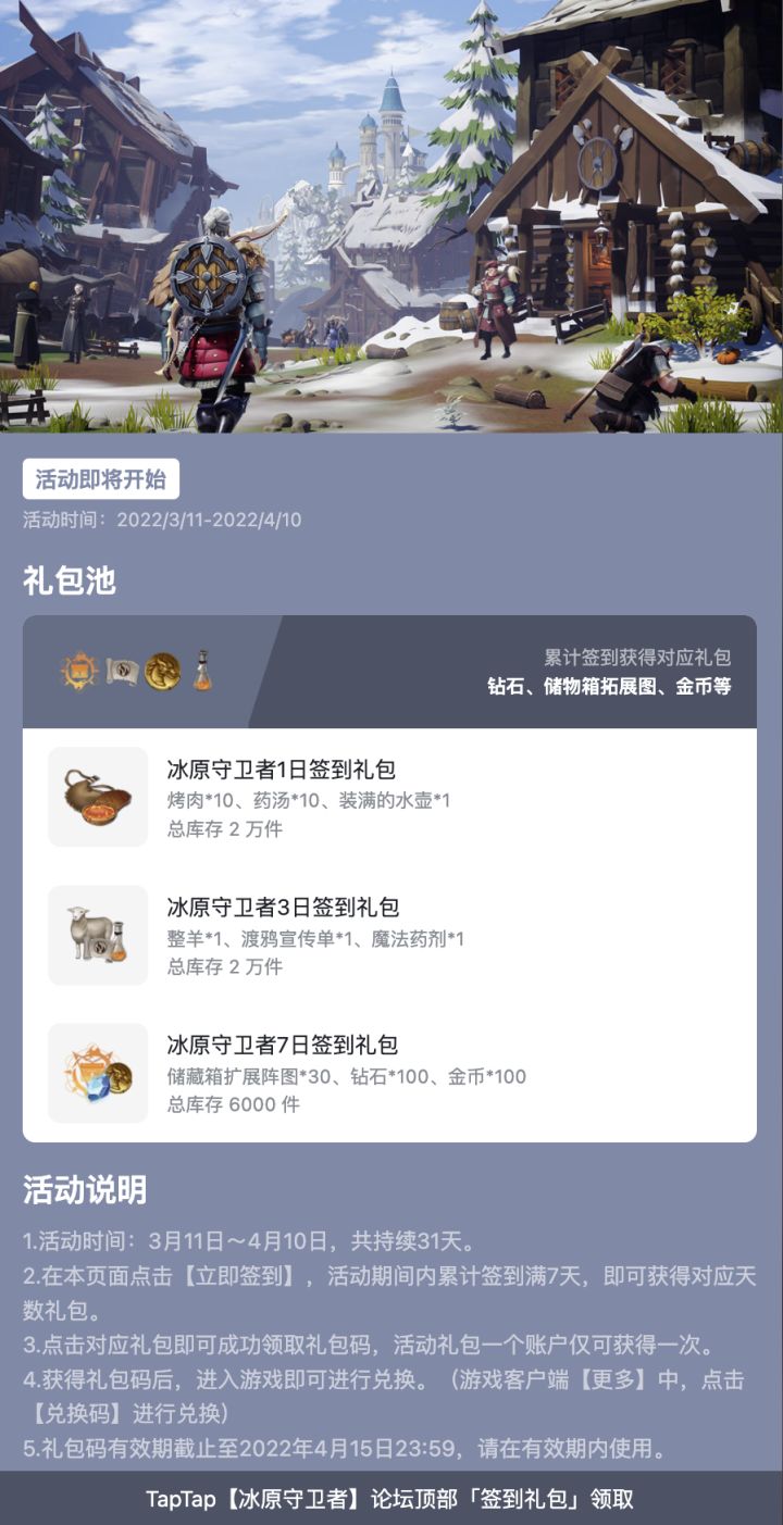 嗨,宝们,大鹅来了这次继续给大家带来新年福利冰原守卫者签到活动也在TapTap新春期间限时开放!活动期间(3月11日~4月10日,共持续31天)点击参一起薅羊毛👉累计签到即可获得对应天数的礼包~一日:烤肉*10+药汤*10+水壶*1三日:大肥羊*1+魔法药剂*1+渡鸦宣传单*1七日:100钻+100金币+储蓄箱扩展阵图*30*活动时间:3月11日-4月10日,共持续31天。*