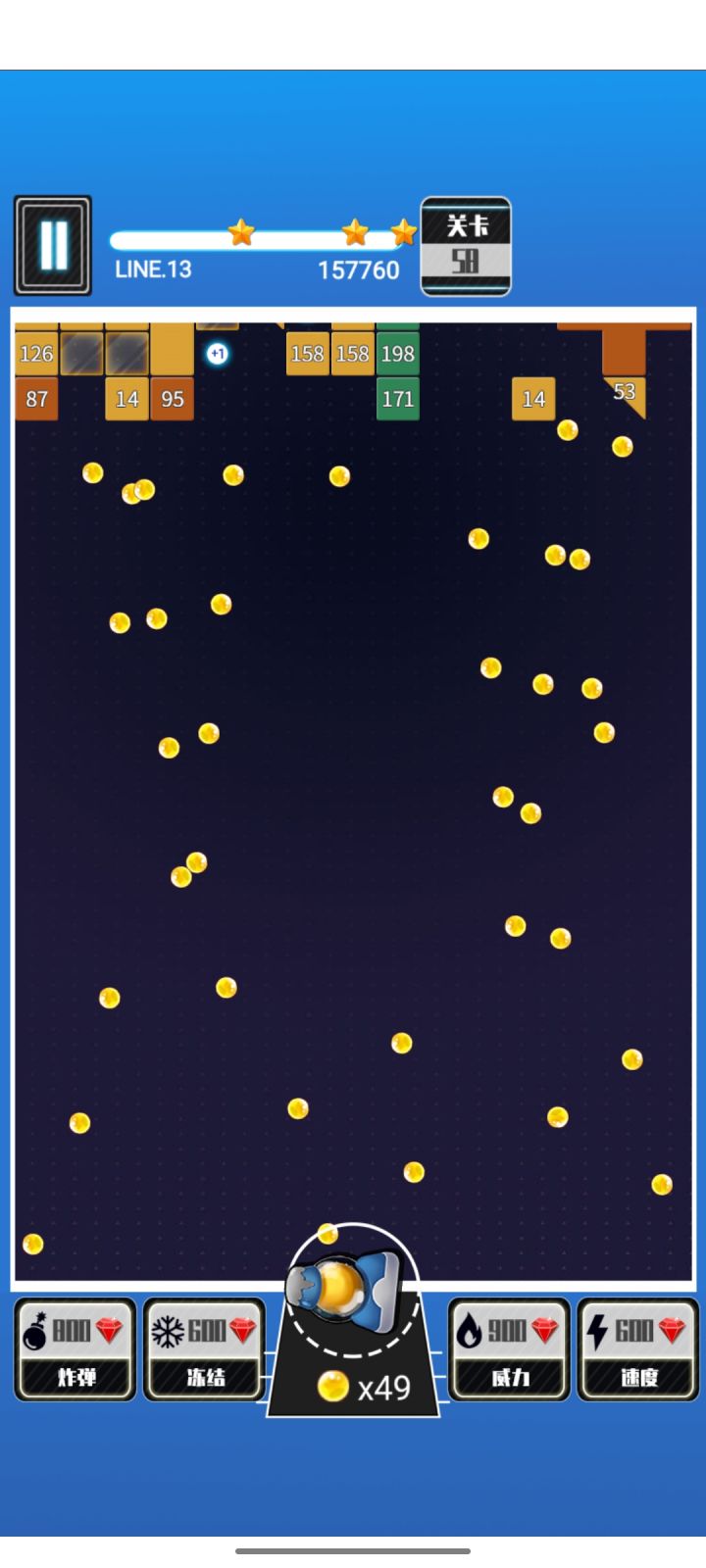 和其他弹球游戏差不多,开始几关还好,我也只玩到40关,因为后面的降落速度太慢了,而且只需把炮台一直射左右下角就能通关没有其他格挡物。