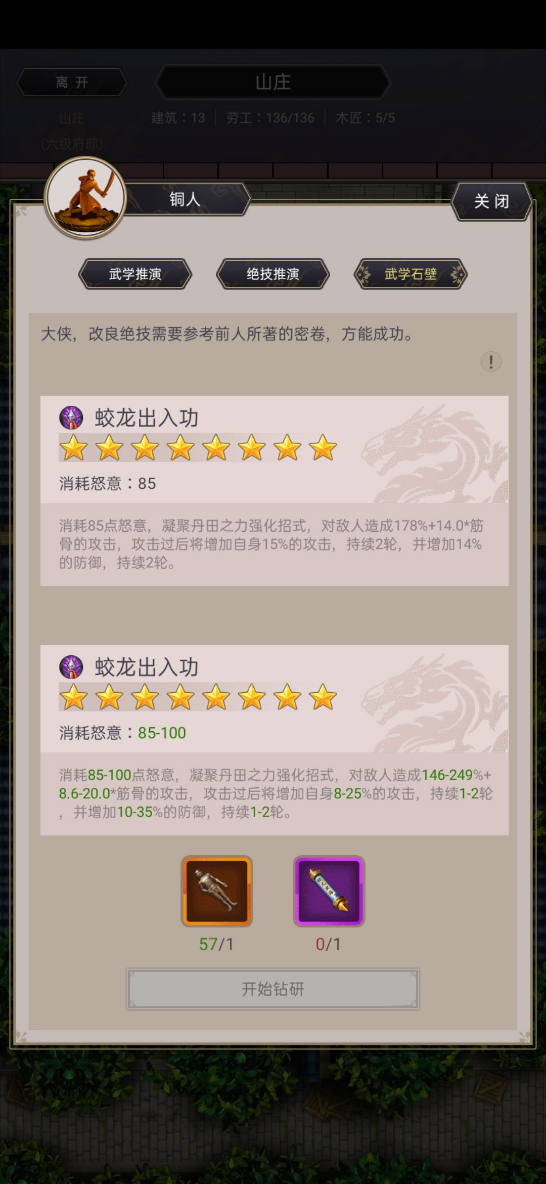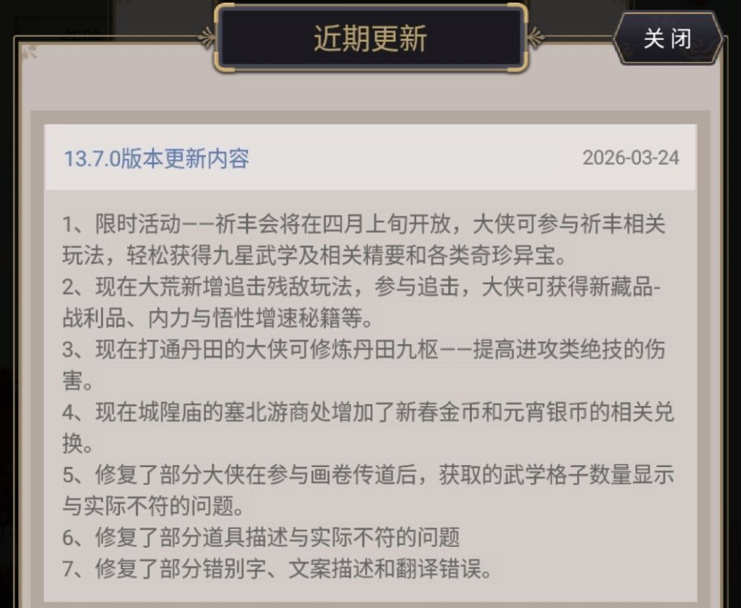 13.0.0版本更新简化内容: 新增《鸣凤驿站》、西域诸部、极意武学、诸子百脉、古篇…… 除鸣凤驿站外新增道具: 1、天竹地区新增《楞伽心经》。参悟可习练极意武学,500佛经换取,换取后自动参悟; 2、天竹地区新增两本残片(锐、钝),每日佛经兑换,限兑9个,300个残片合出一本橙色古简(参考橙书); 3、异域商旅天竹商人新增两本残片(锐、钝),残片与2相同,只是此处使用玉璧兑换,日上限300,氪佬