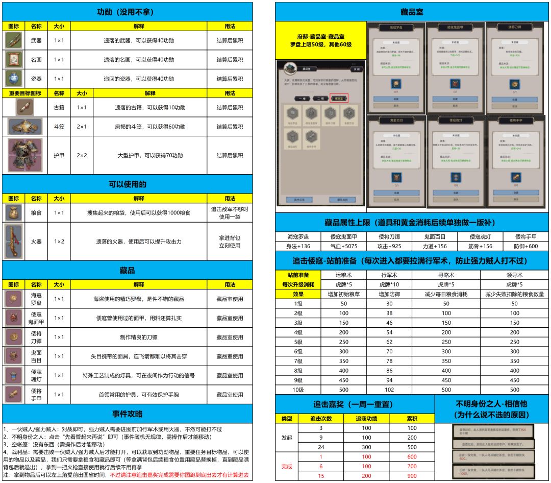 1、只加行军术(每次开局都记得升一下,每次结算威望提升军团等级后会有多一些的虎牌可以提升) 2、对战的有强力贼人和一伙贼人,打完会有100功勋,部分打完会有战利品拿,记得拿取,背包里始终得有一个或以上粮食,只多不少 3、空帐篷就是没东西,“不明身份之人”选“先看管起来再说”,不要选“相信他”(有四种情况,加300粮食,无影响,减500粮食,减1000粮食) 4、遇到战利品有加攻击或防御的,进背包立
