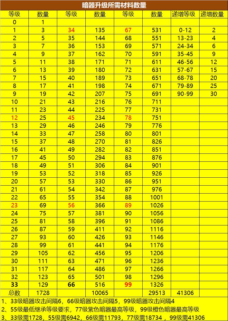 暗器升级所需材料数量