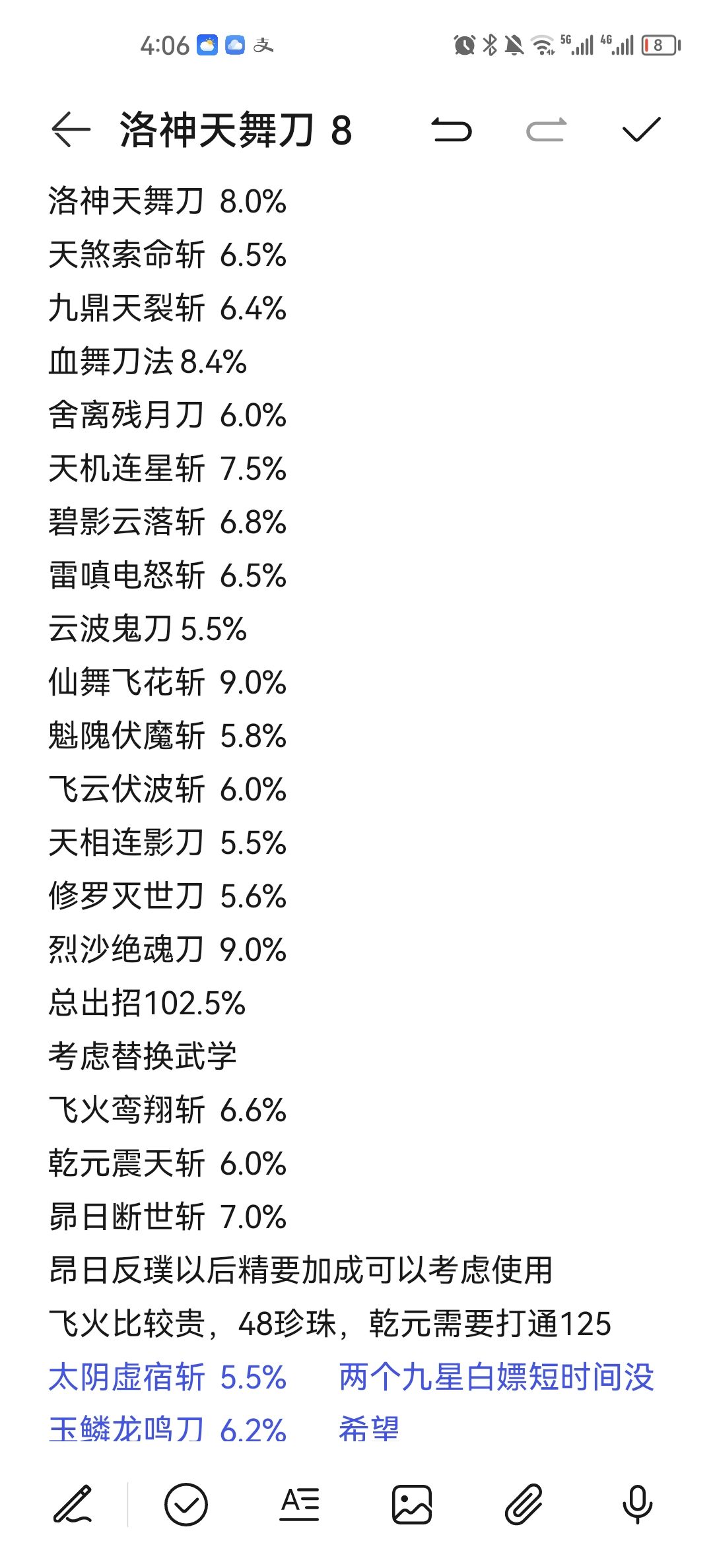 6元白嫖刀,整理了一下白嫖主动刀法参考,适用于0氪或者6元等珍珠紧缺的白嫖选手,微氪有更优解 图一是我没过125的出招,图二是我目前使用的, 飞火48珍珠,虽然是毕业武学,但是白嫖性价比不高,微氪也建议6反换完以后再换 玉麟龙鸣刀198珍珠,白嫖绝对不建议在6反还完之前憋这个 修罗灭世刀要重点说一下,需要在君山花费36刀令购买,费用高昂的同时强度却只能算一般,再加上反击的缘故,大多数玩家的刀令都不