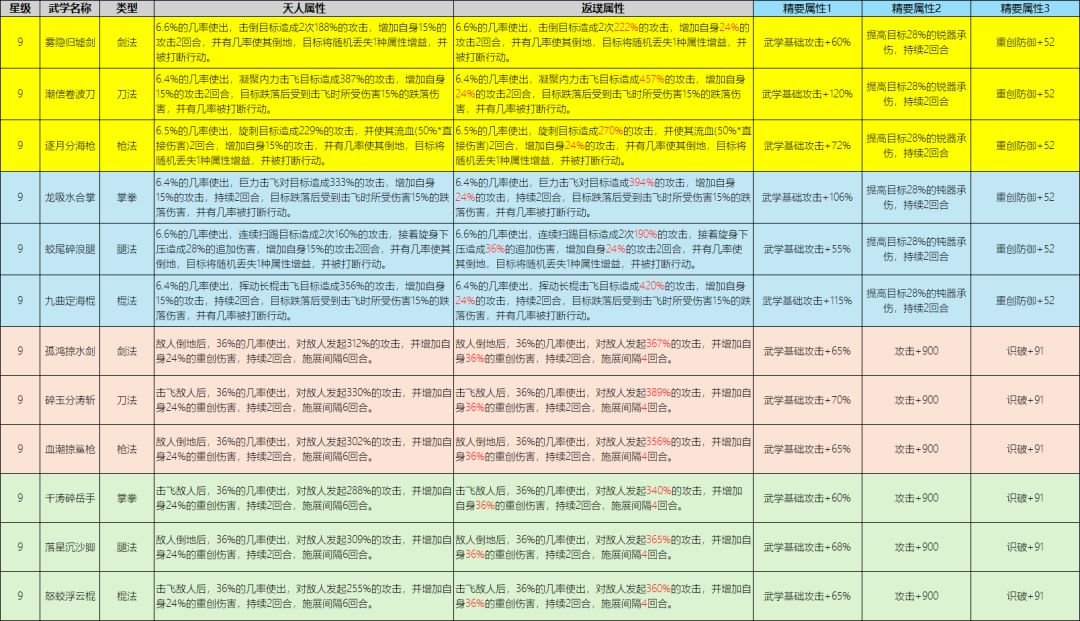 首先明确一点,刀法所谓的职业特色只有一个,那就是“高伤害”,那么在武学同质化的版本环境下如何打出来这个“高伤害”这个特色呢? 1.各类武学buff叠加+武学本体高百分比基础 buff类:龙凤协同贪狼妙音+各类9星武学buff已经趋同,就不用多废话了 武学百分比基础:远古时代(以风云录第一章版本为界限)刀法武学的特色就是本体百分比远高于其他五职,大约在25%左右。但是在首次庆典9星武学更新后这个特色