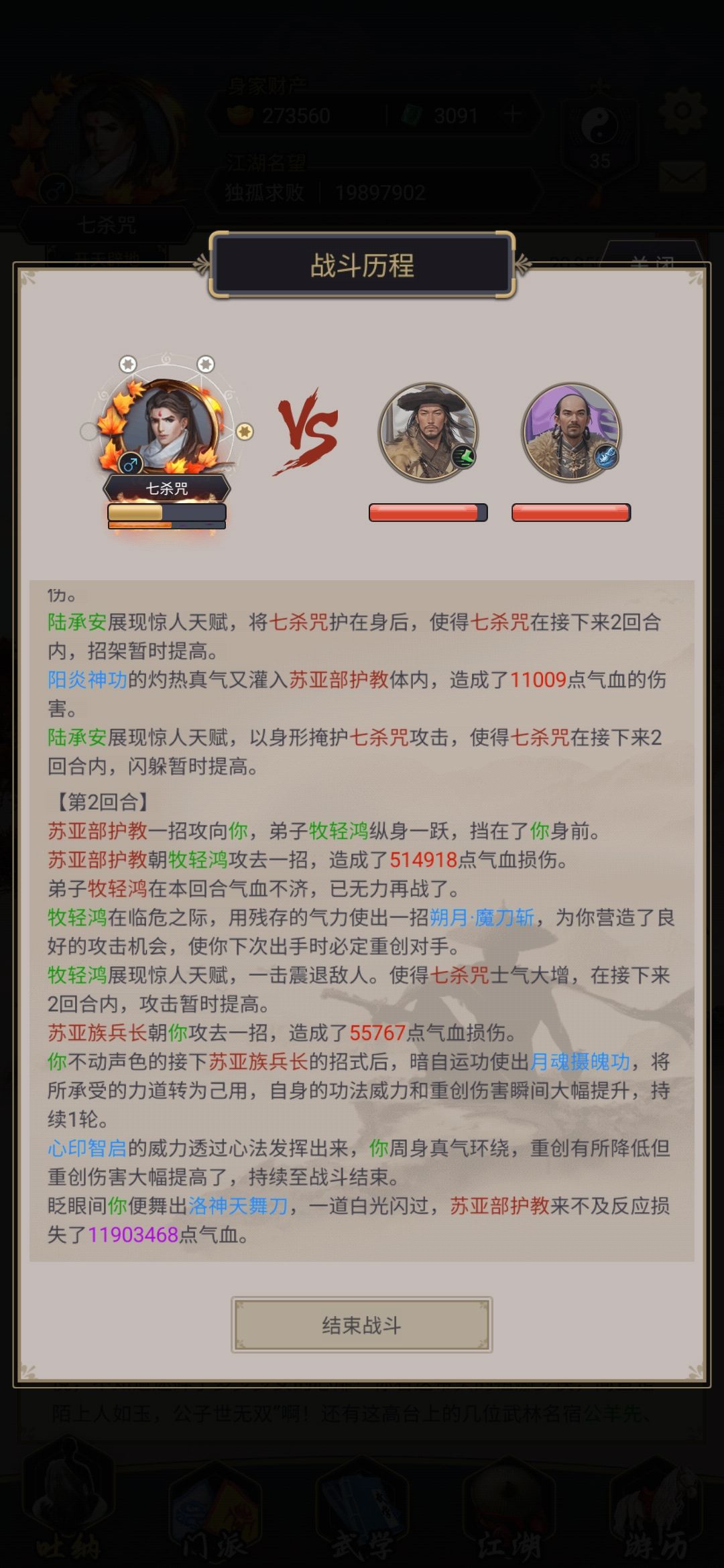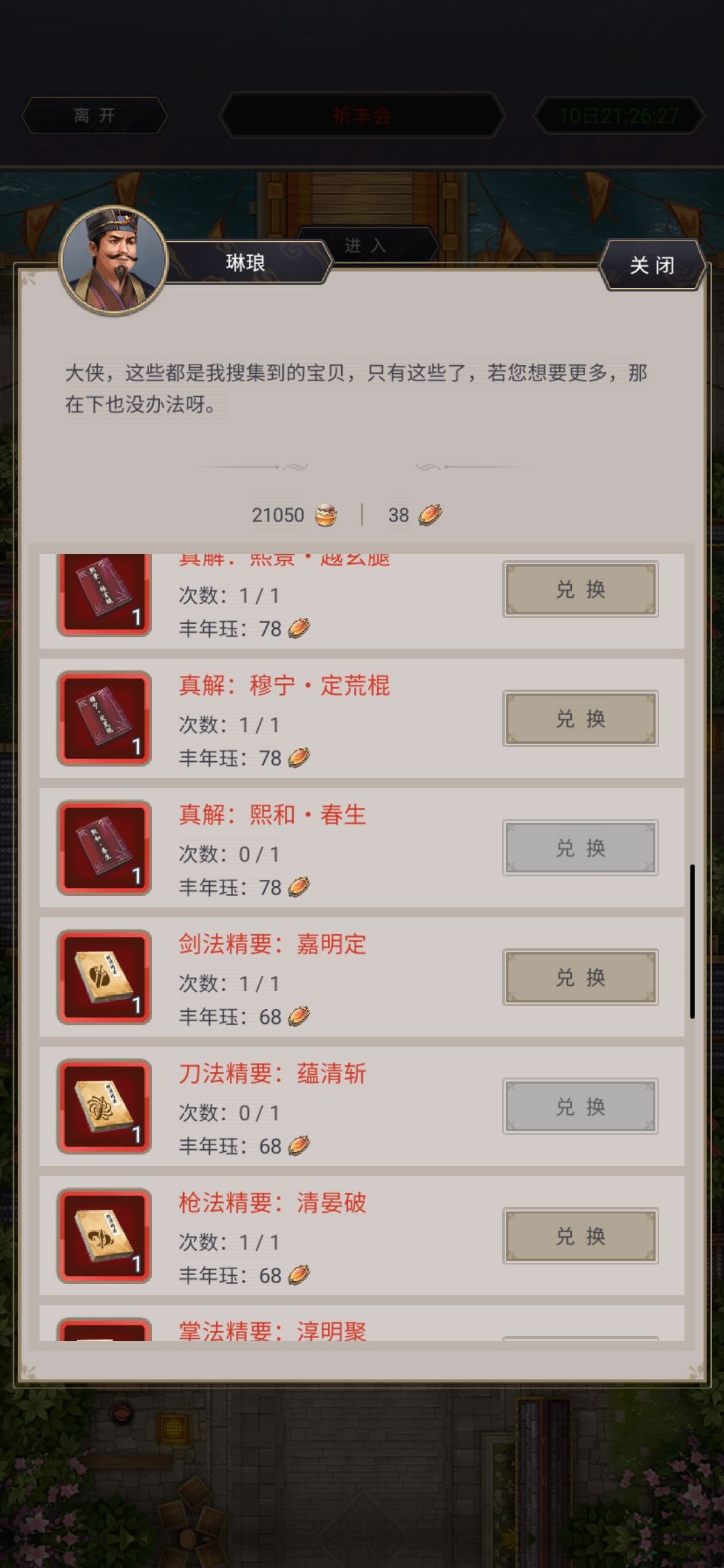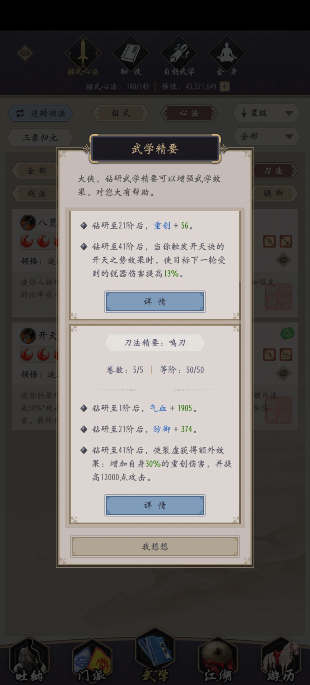 一、吐纳界面 刷两百多次历练,大概三次 丹田运功,一天一次 外练,后山有丹就点 内练,满级就升级或者换另一边 天运符,领珠子和巧舌宝箱 背包,领各任务宝箱和照影玉璧切磋 二、门派界面 掌门告假,三天一次 藏宝阁换八卦,一天12个 比武台切磋,9小时3次 讲义厅,十二点进,隔一个半小时看一次 三、武学界面 返璞或者升级武学,搭配背包2%悟性 四、江湖界面 1.府衙: 厢房侠客切磋,书房文人烧香,装饰
