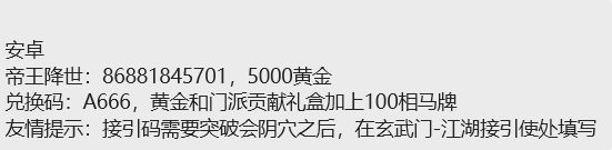 图片接文字下面: 附福利码:A666 接引码:86881845701 本攻略只讨论重剑 1.氪度低,更亲民。重剑是十分推荐微氪玩家选择的。 2.过图强力,发育快。重剑无锋具有全江湖最强心法精要力无咎,配合腿弟子的地龙突相当于百分百破防打真伤!反之身法剑即使重氪也会在一些命中高的图卡死,重剑是可以轻松过日本的! 二.前期门派路线 1.北马帮(相马术) 2.关中剑派(流云剑法,心剑诀) 3.武当(纯阳