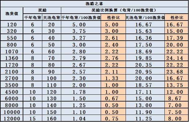 九:昆仑天池 时间:16号10:00开始。 7+3模式,前7天参与活动,后三天只能兑换资源; 活动操作很简单,这里重点谈资源利用:如图1,天池档位奖励性价比是降低的,这与上篇中的江湖驰援正好相反,对于有想法的白嫖玩家来说,天池不应该攒资源,每个月使用到对应档位即可,这里我没有具体计算过白嫖与微氪每月分别可以达到下图中哪个档,我个人的方案是每个月玉璧使用:(4+9)*7=91,然后渔获值交21