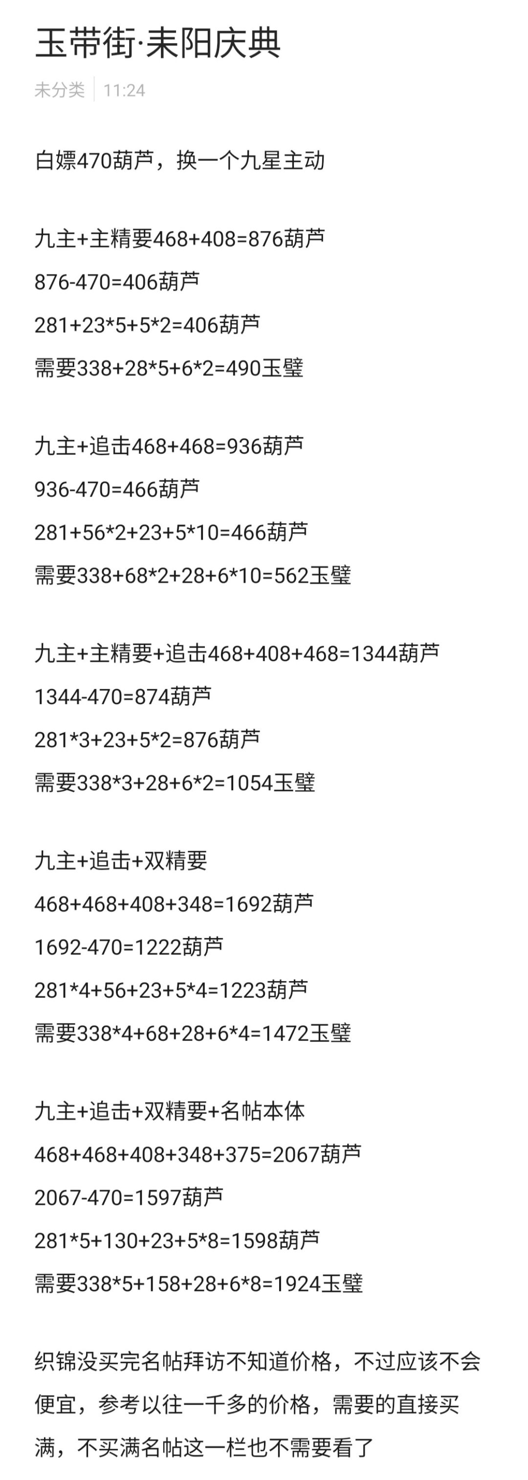 礼物和往常一样,黄金,6玉,36玉,58玉四份礼物各限买三次 织锦价格为25葫芦一盒10个,总共40盒,拉满再加1000葫芦,1597+1000=2597葫芦 281*6+130*6+23*4+5*8=2598 需要338*6+158*6+28*4+6*8=3136玉璧