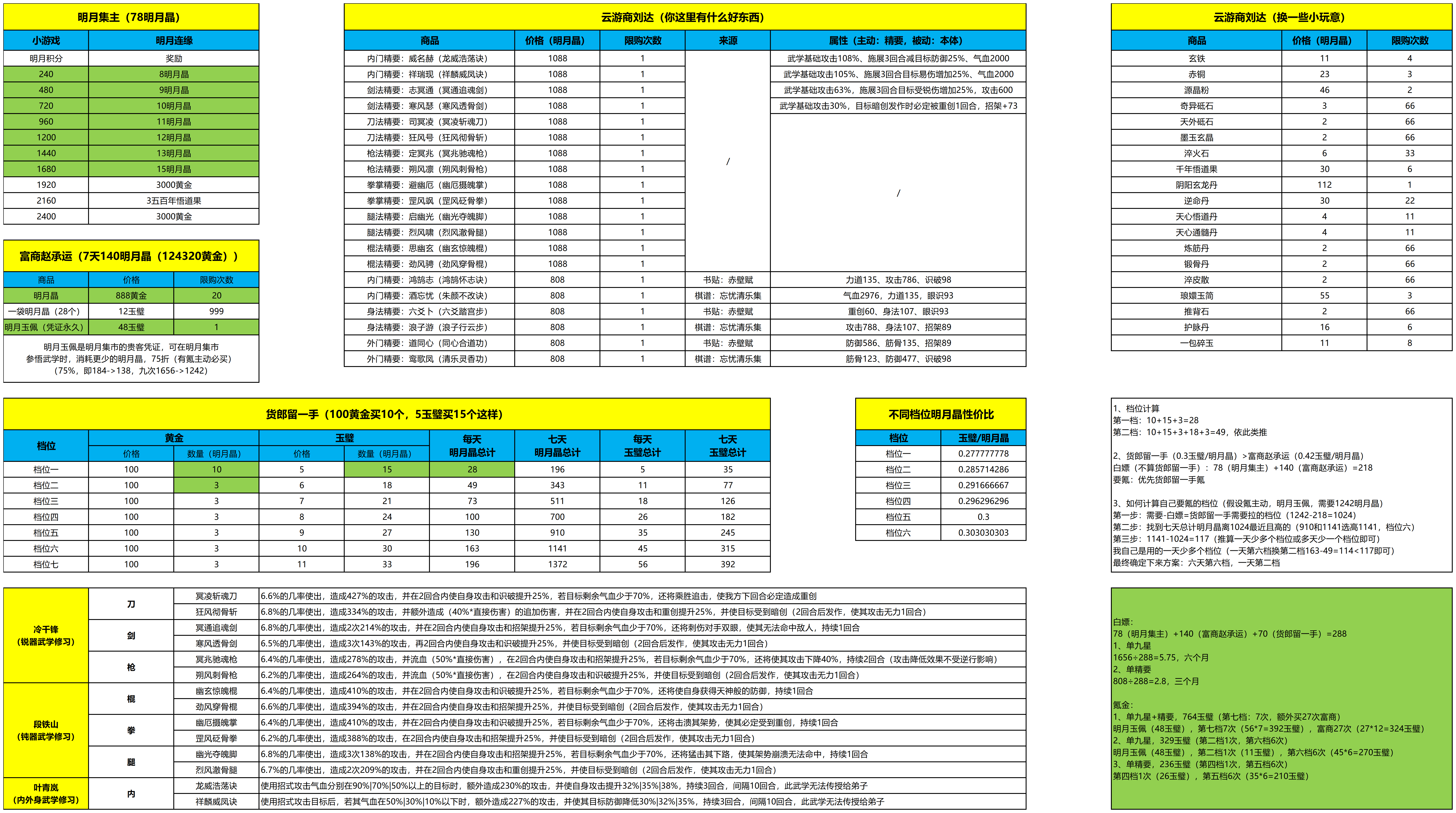 每月9号开启,兑换庆典返场九星及其精要,红书精要 明月集主:小游戏获取积分,总共可得78明月晶 富商赵承运:购买明月晶,每天刷新共7天,明月玉佩减免参悟武学消耗(75折),氪金必买(如果只缺精要,武学都有则不需要买) 云游商刘达:明月晶兑换返场武学精要和各种材料 货郎留一手:每日7轮购买明月晶,共7天 0玉获得10明月晶 5玉获得28明月晶,3.6个/玉 11玉获得49明月晶,3.55个/玉 18