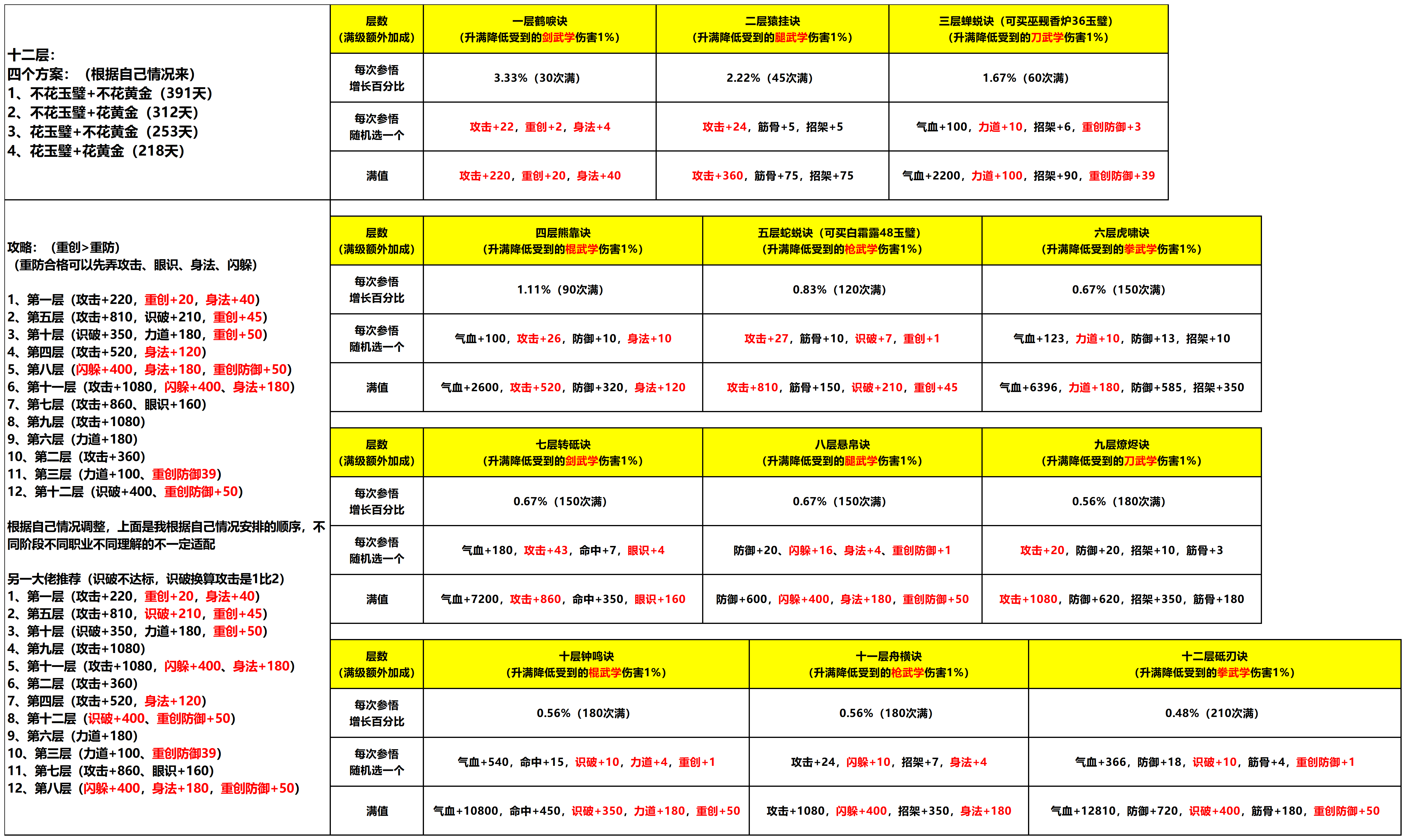 最近有很多新人问我为什么重创之后伤害那么低,想知道重创伤害怎么获取 在这里说下通用的 1.穴位26-10,自身150%重伤 2.武器八卦盘全部九阶可选择10%重伤 3.护心镜八卦盘全部九阶可以选择10%重伤 4.主心法返璞归真流动气脉可以选择3%重伤 4.副心法返璞归真流动气脉可以选择2%重伤 5.山海关心印凝霜十二重永久增加3%重伤 6.山海关心印大志十二重永久增加3%重伤 7.枫叶框佩戴5%重