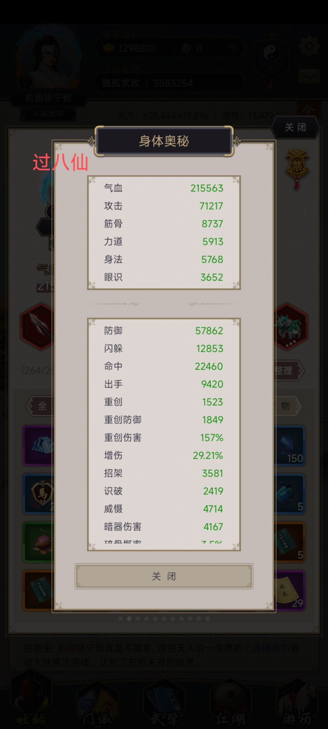 2.9过图七星堡历时35天,附属性图,无心法精要,洗髓45,弟子4个,腿御15,剑御41,1地龙(当时干了一个特别蠢的事,我把腿御加到腿破上了,右非卡的更久,六绝3次就过了,实际过图要求属性应该比这还低) 下面说一下我的个人搭配和玩法 心法带驾崩(无精要),钢筋铁骨,主堆防御和重创防御,神兵带毒和流血(有人可能会推荐你驾崩带破阵,但是这个时期,减攻击的技能太少,我个人不建议带)(悄悄说一句,推荐你