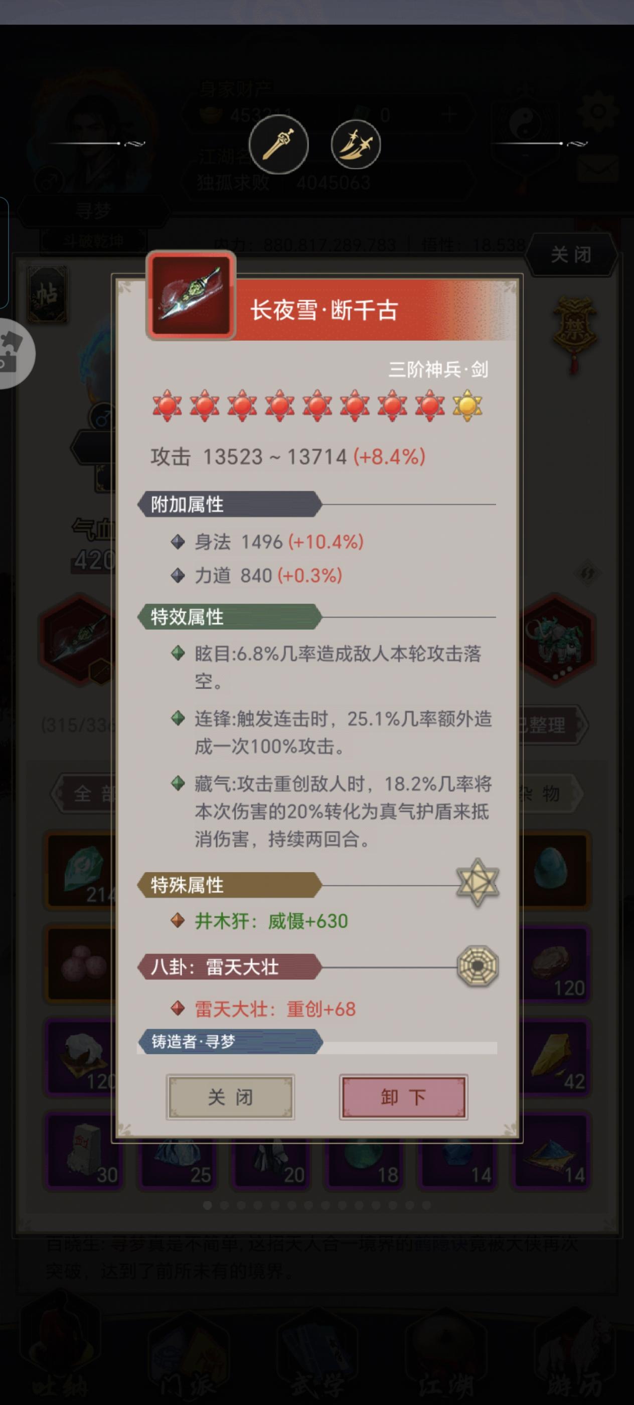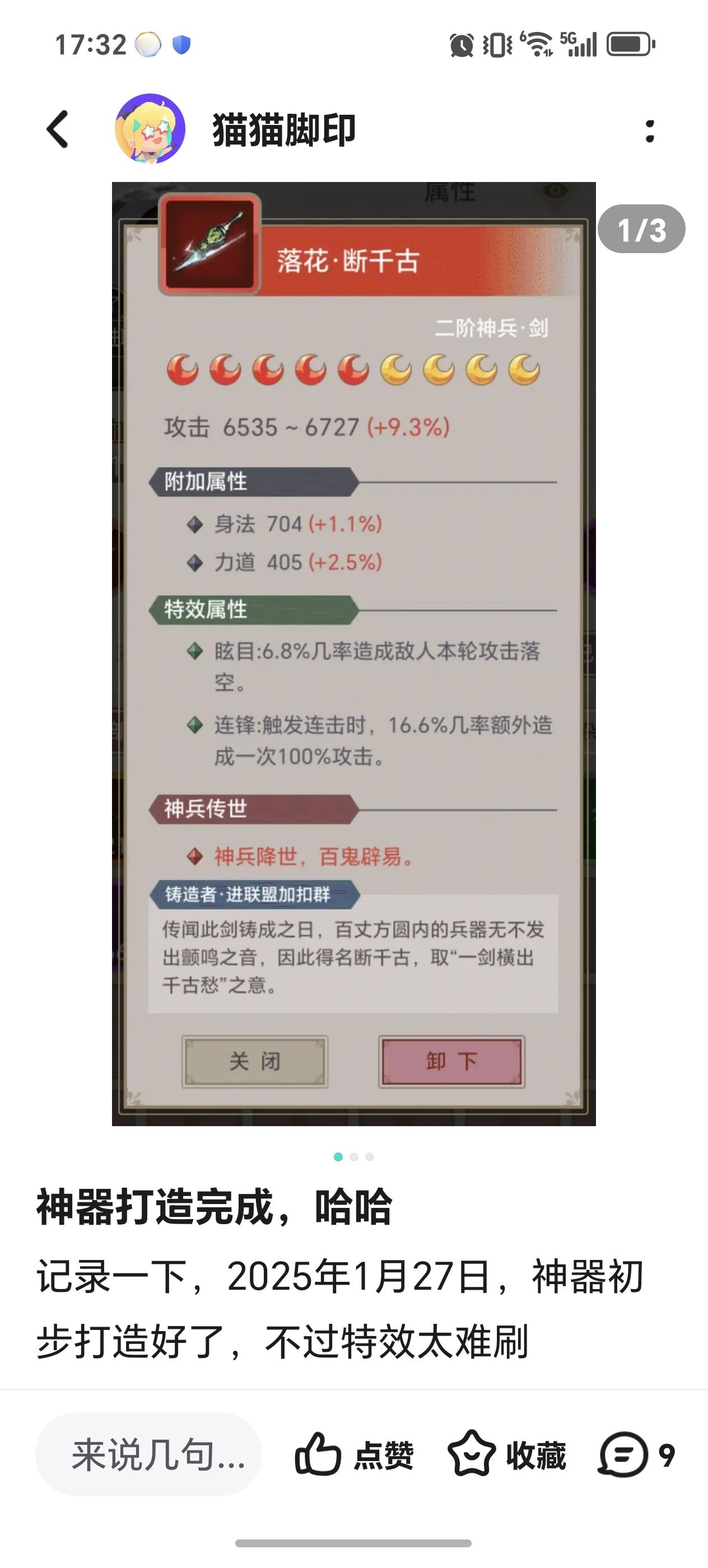 天地为炉,造化执锤,阴阳作炭,我身淬火。三百个昼夜不过一瞬——日月是鼓风,星尘是矿砂,每一次失败的微光都融入阴阳流转的熔流。终于于2025年12月16日炼出了这三阶神兵断千古。今日把示君,谁有不平事。可惜还是惜败于北冥傲之手。