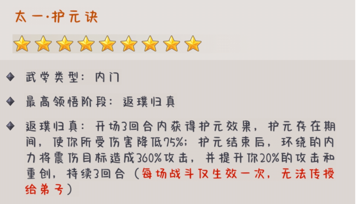 良师活动也过去大半了,在这里对这个太一护元的技能做一个简单的评价。烂!烂!烂!这么垃圾的技能居然需要氪金。先简单解析获取难度:1、对白嫖来讲,邀请一个怨种黑奴完成任务,正常可以得到1042破碎的玉璧;2、充值侠影风云326档(一次风云再起),可以获得61破碎的玉璧;3、充值小月卡(三次风云再起+一次风云机会),可以获得61*3+382=565破碎的玉璧;(可直接不花玉璧拿精要)4、大