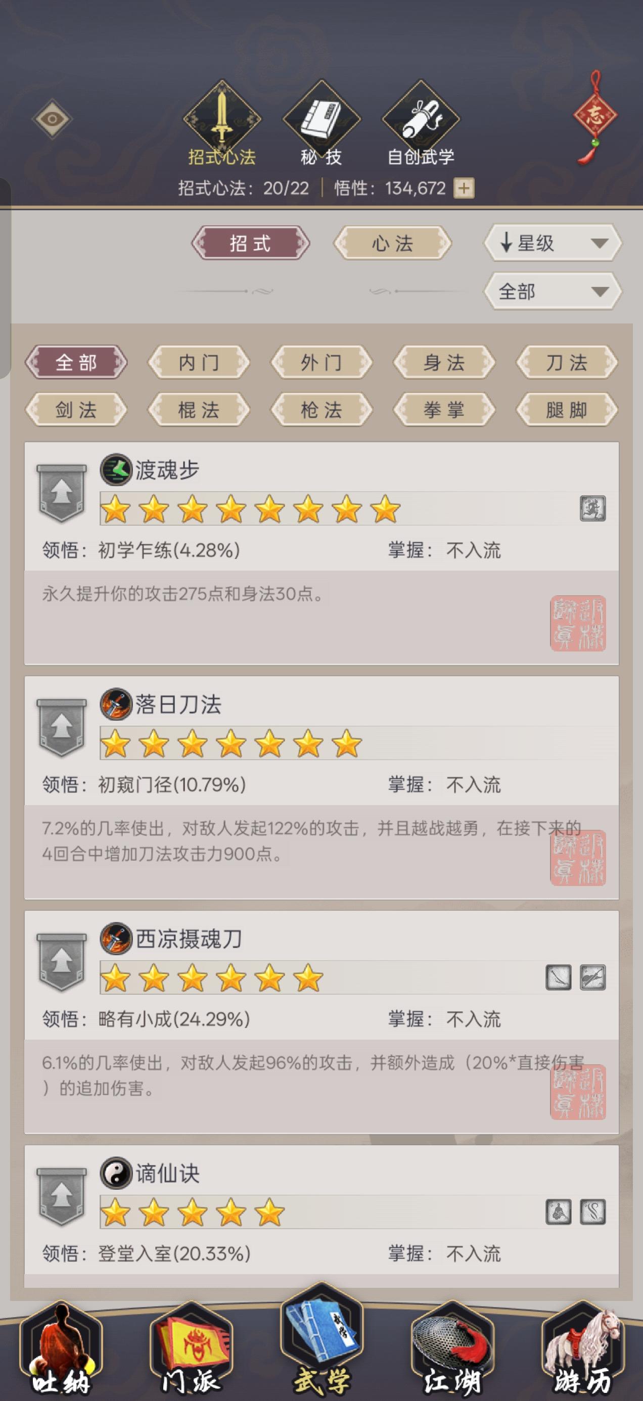 T1:开天决、不动明王、隔山打牛、重剑无锋T1.5:驾崩枪T2:八荒真决T3:圆转如意、踏天无痕T4:游龙惊鸿、无中生有、跗骨心诀T5:天罡血战决