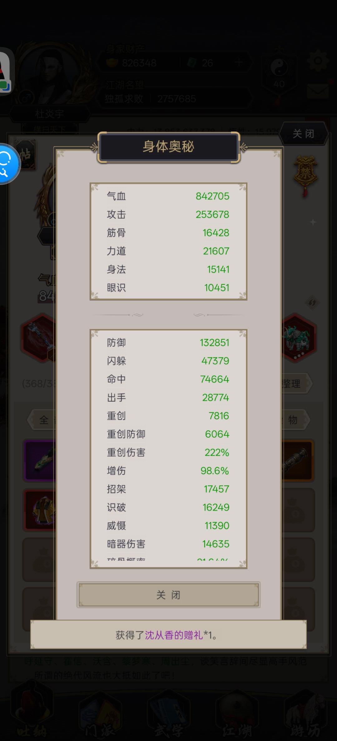 鏖战67回合,出了16个绝技,后面要着手换不占出手绝技198了,真武绝技系数还是太低,天音进度为过了两个怪