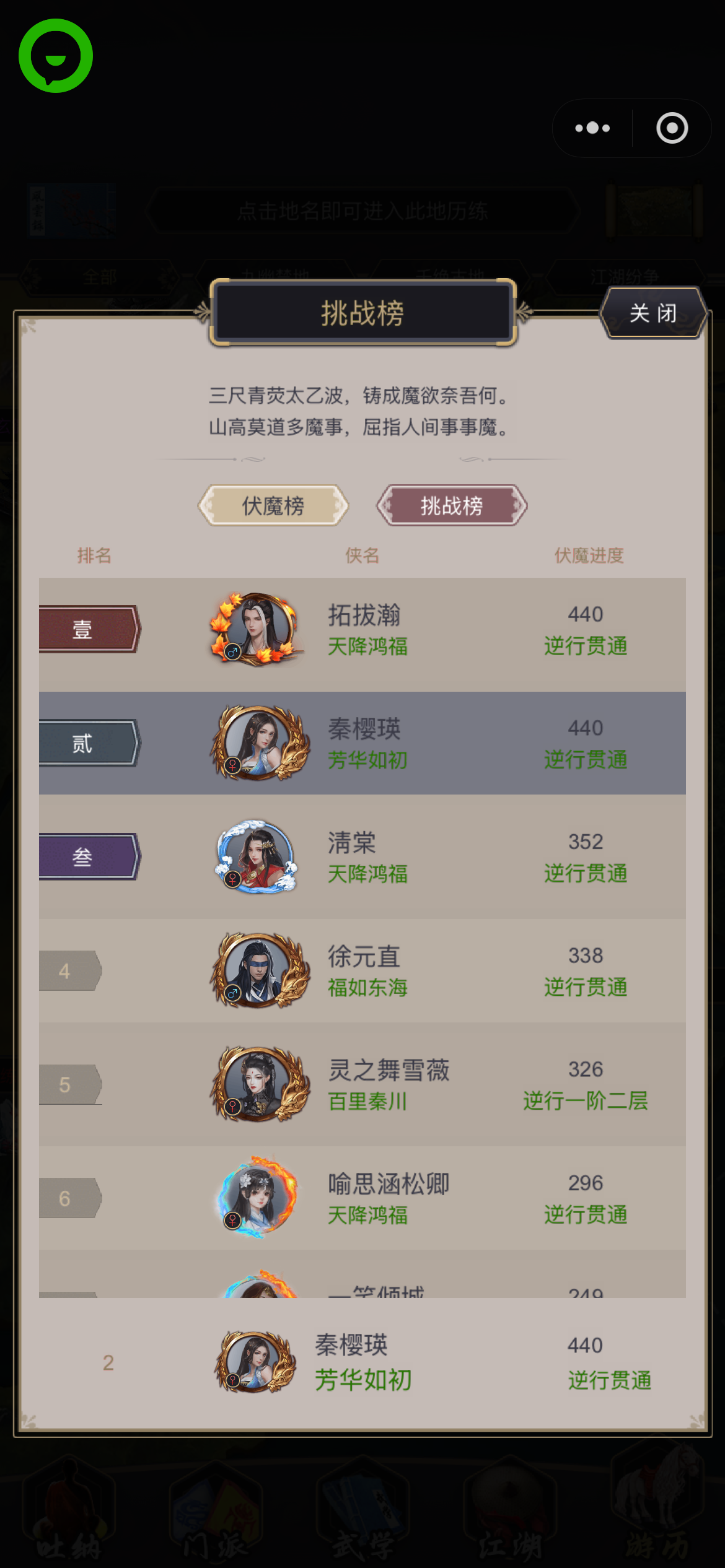 微信小程序:饮马歌-九霄神雷-木兰个人进度:断情谷2025-09-18 横渊派2025-11-03 雷火门2025-12-05 唐门隐宗2025-12-14 藏剑山庄2026-01-06 医仙岛☆最新:☆暂无需更新:☆BUG:☆持续更新:1、地图(掉落物、属性、破御、武学、机制、技巧)2、西域3、过图记录4、日常5、周活动6、月度活动7、装备8、提升(升阶、洗髓
