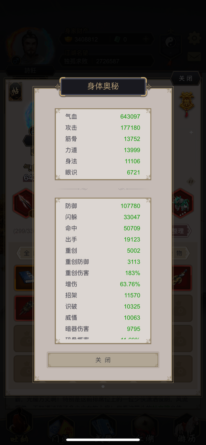 过唐门28天,李哥心情好放人了,终于也是一个医仙仔了过图情况:不动,飞蝗,阴天(晴天顶不住,6回合就能把我秒了),60剑御,锐剑减甲,然后是影响最大的:云!梦!剑!阵!面板方面:1. 识破1万+是最基本的条件,达不到有极大概率被疯狂招架,伤害掉得非常夸张;2. 其他比原来预期的过图属性低了一些(原本预期需要18-19万攻,接近满爆,84增伤左右),对比了下氪金