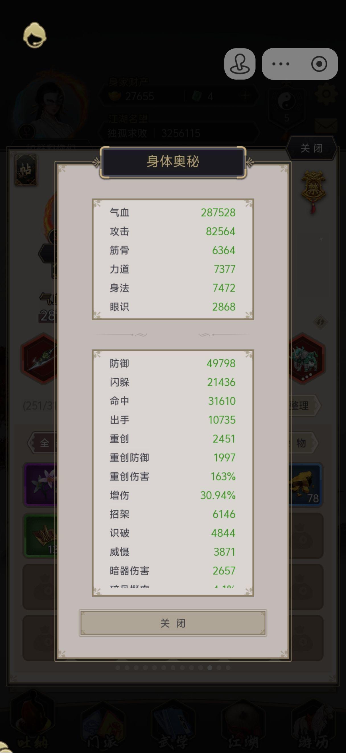 过唐门28天,李哥心情好放人了,终于也是一个医仙仔了过图情况:不动,飞蝗,阴天(晴天顶不住,6回合就能把我秒了),60剑御,锐剑减甲,然后是影响最大的:云!梦!剑!阵!面板方面:1. 识破1万+是最基本的条件,达不到有极大概率被疯狂招架,伤害掉得非常夸张;2. 其他比原来预期的过图属性低了一些(原本预期需要18-19万攻,接近满爆,84增伤左右),对比了下氪金