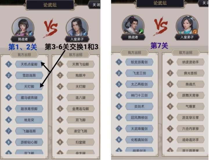 每月开的时候基本不需要设置技能。腿只用一套技能,剑只用一套技能,自动保存在各自技能组内。每月开打的时候只要选弟子就行,不需要重设技能组。腿打完1、2关,只要交换1、3两个技能就可以打完3、4、5、6关。下个月打的时候也只换一次这两技能。剑的技能组,觉得不好用的话,可自行替换成的其它的。