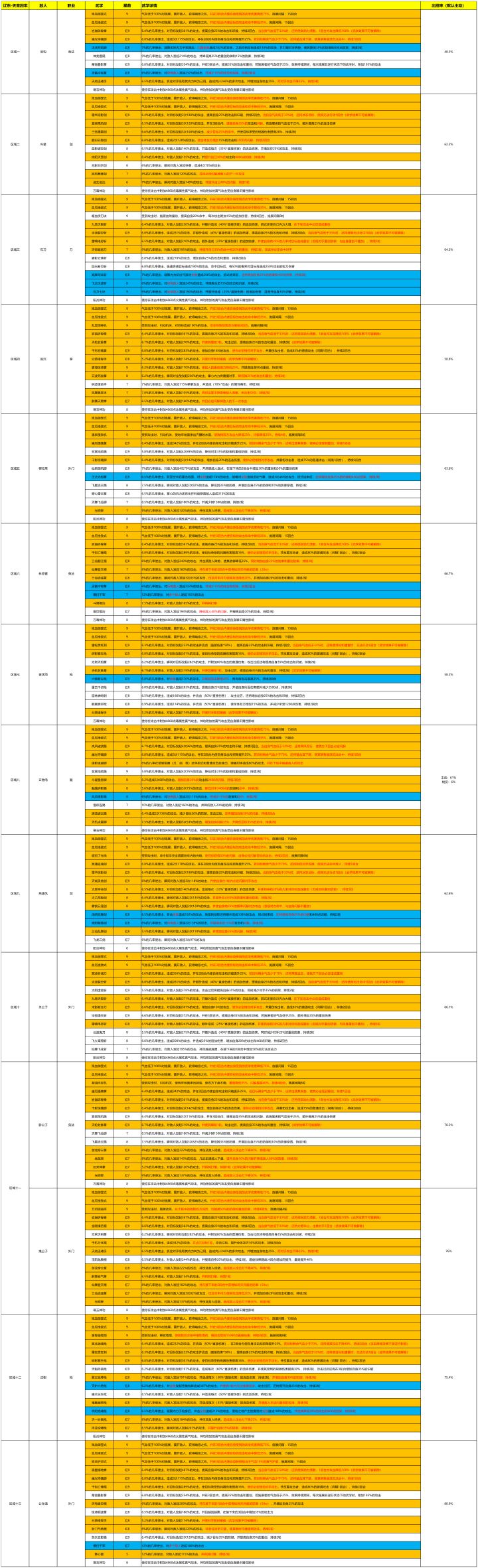 1、无天气加成2、怪物技能组经过测试:所有怪:"残血御罡式"是气血低于75%时触发,施展间隔是12回合所有怪:"血厄挫敌式"是气血低于25%时触发,施展间隔是12回合BOSS:"绝命护灵式"是气血低于10%时触发,施展间隔未知对战里面有个"锁脉困力机"开局就触发,双方攻击下降防御提高,持续4回合,施展间隔是8回合(具体数值暂时还不清楚)下面数据是地图右上角江湖传闻里面获取,麻烦官方更